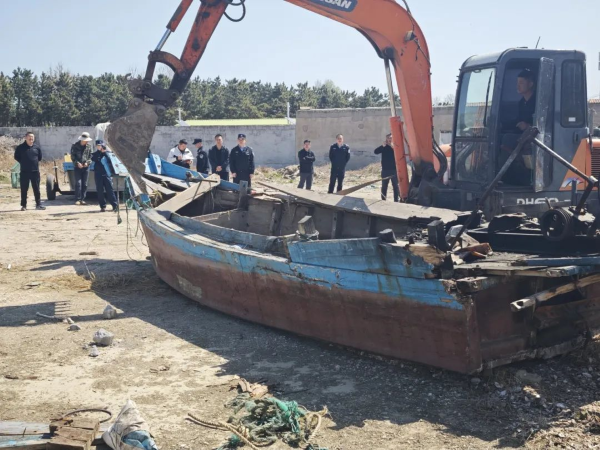 在指定的拆解区域,工作人员指挥挖掘机、起重机等有条不紊地开展工作。本次集中整治行动中现场共计查扣12艘 “三无”船舶,其中10艘按程序进行现场破拆,并由执法人员全程监督,确保拆解工作严格按照规定流程进行,做到拆解彻底、不留隐患;剩余2艘予以扣押,下步将进行公示,待公示期满无异议后将进行集中拆解。此次行动也赢得了辖区渔民的广泛认可,他们纷纷表示,“三无”船舶的取缔,让他们的渔业生产更加安全、有序,合法权益得到了更好的保障。