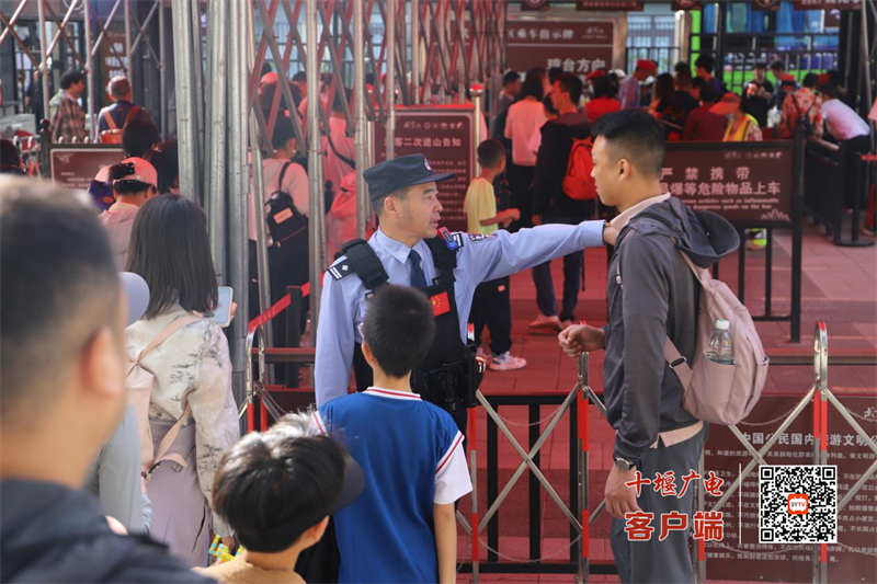十堰广电讯(通讯员 周容翼 李强)“左侧乘车到南岩,右侧乘车到琼台,如果乘坐索道就到琼台……”5月1日早上7点30分,在武当山景区游客服务中心验票口,十堰市公安局武当山特区分局情指中心民警陈明均正耐心地为几名游客指路,并在地图上为游客标出线路。