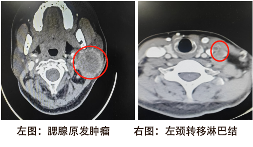 王女士的颈部增强CT显示,腮腺区恶性肿瘤伴颈部淋巴结转移。