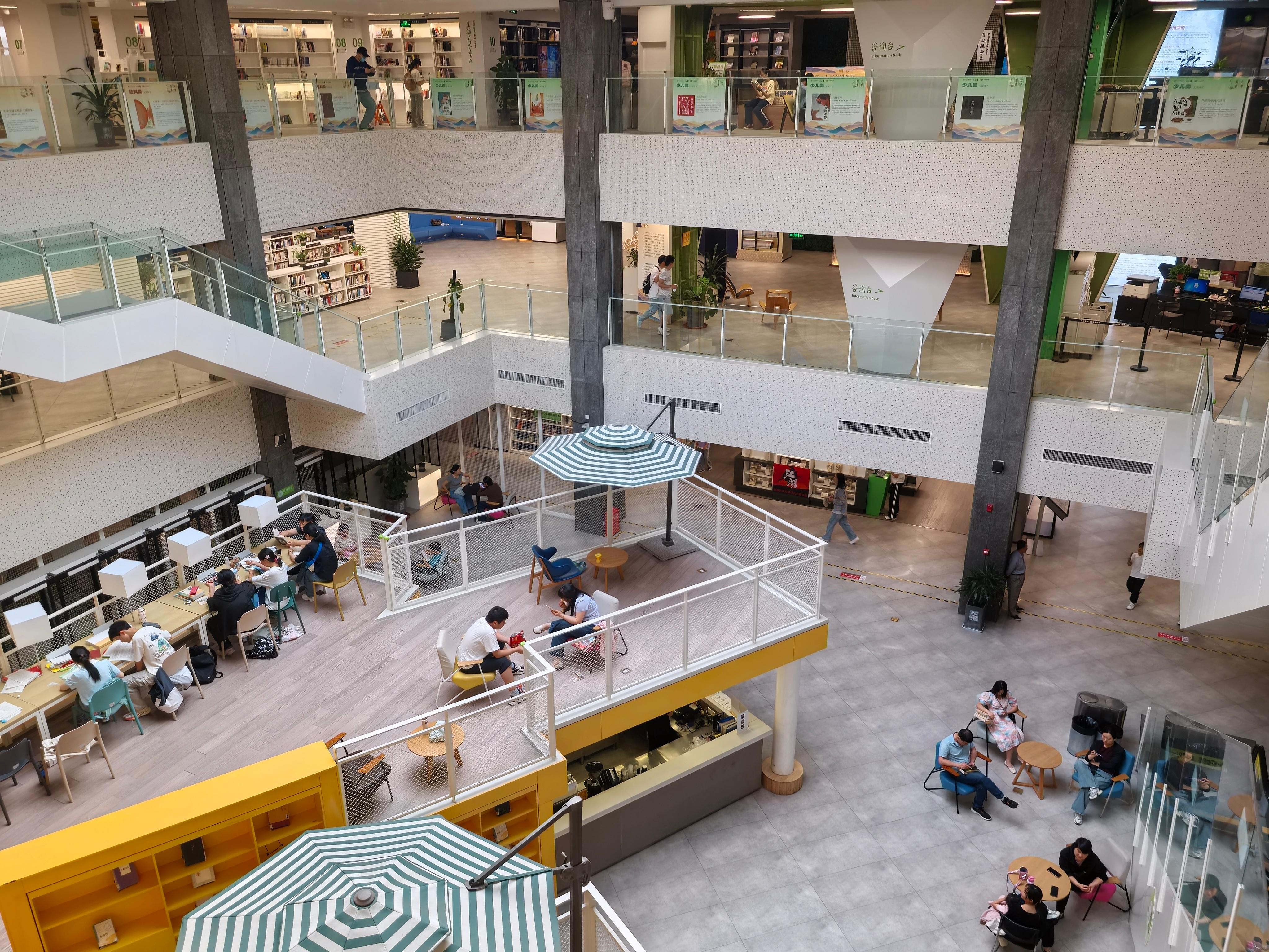 在二楼,各个阅读空间也都坐满了读者,大家各自手捧书本,安静地阅读,即使说话,也都压低了声音;在少儿区,走廊上站着或坐着许多家长,都在耐心等候室内沉浸在书本里的孩子;在通往三楼的阅读平台,也坐满了人,还有家长带着孩子坐在一起,看着各自喜欢的书。