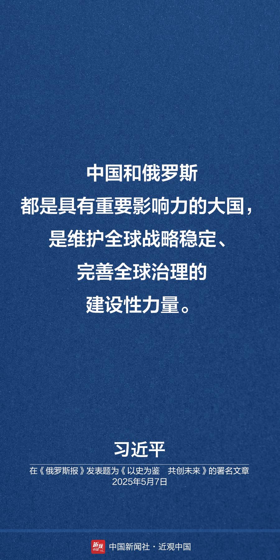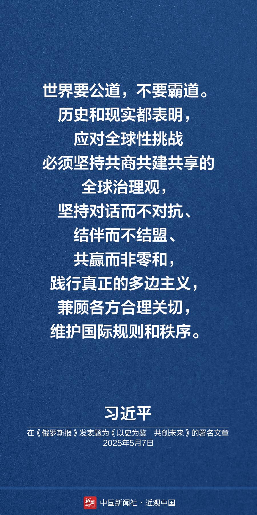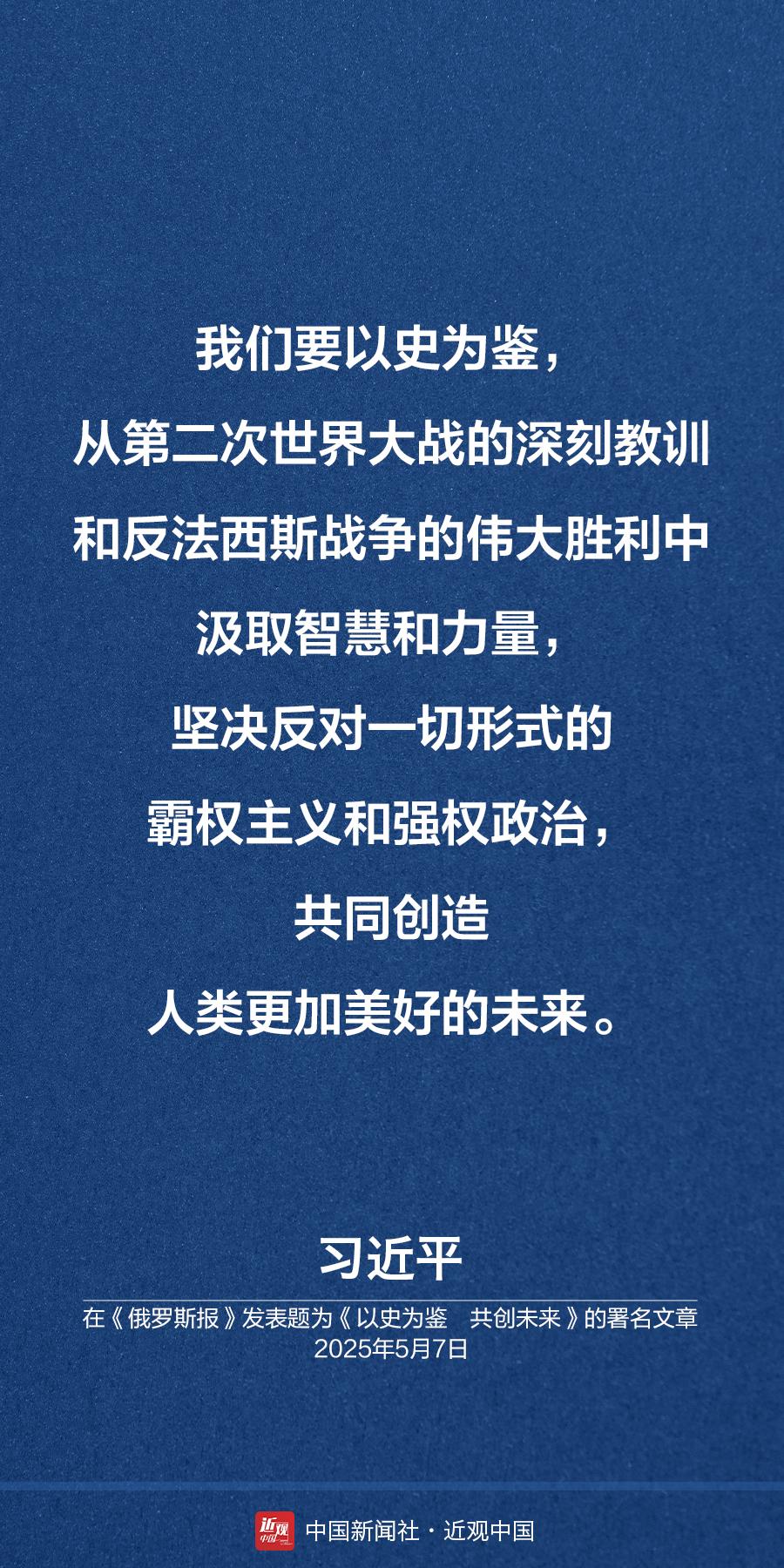 习近平:坚决反对一切形式的霸权主义和强权政治 2025-05-07 16:08 来源:锋行天下 5月7日,在赴莫斯科对俄罗斯进行国事访问并出席纪念苏联伟大卫国战争胜利80周年庆典之际,国家主席习近平在《俄罗斯报》发表题为《以史为鉴 共创未来》的署名文章。文章指出—— 【编辑:胡寒笑】