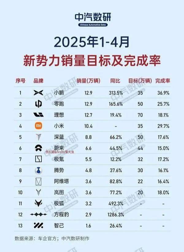 数据显示,今年前4月尽管头部品牌吉利、小鹏、零跑仍以同比超100%的增速冲刺,但年度目标完成率集体“失速”——前四月“优等生”理想仅完成年目标18.1%,甚至背靠比亚迪的腾势也仅完成了16.1%,新势力中只有小鹏以36.9%的完成率跨过及格线。