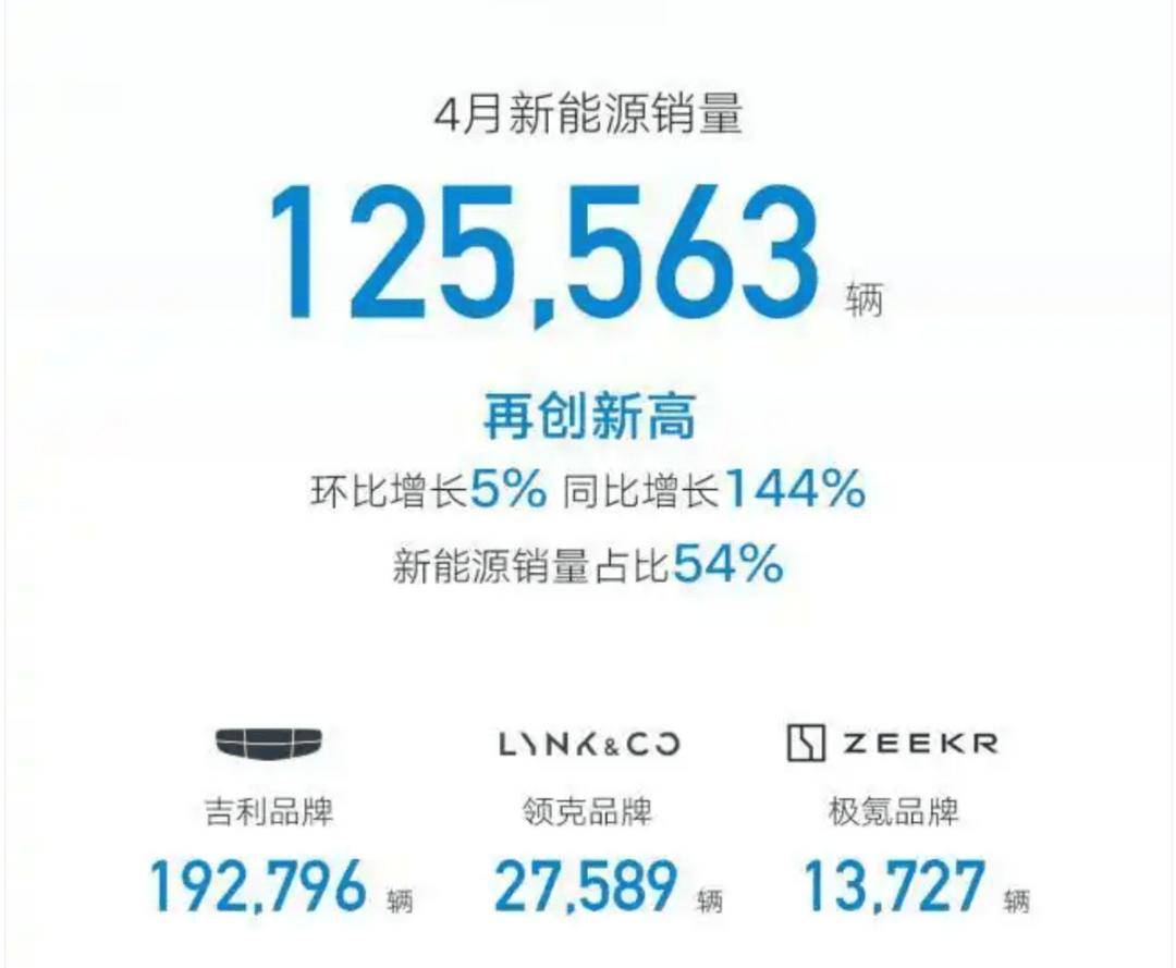 4月份吉利新能源车累计销量达到了12.5万辆,同比增长幅度高达144%,新能源销量占比已经达到了54%,创下了月销的新高。尽管距离比亚迪还有超过两倍的差距,但也是自主车企里为数不多月销达十万量级的车企。