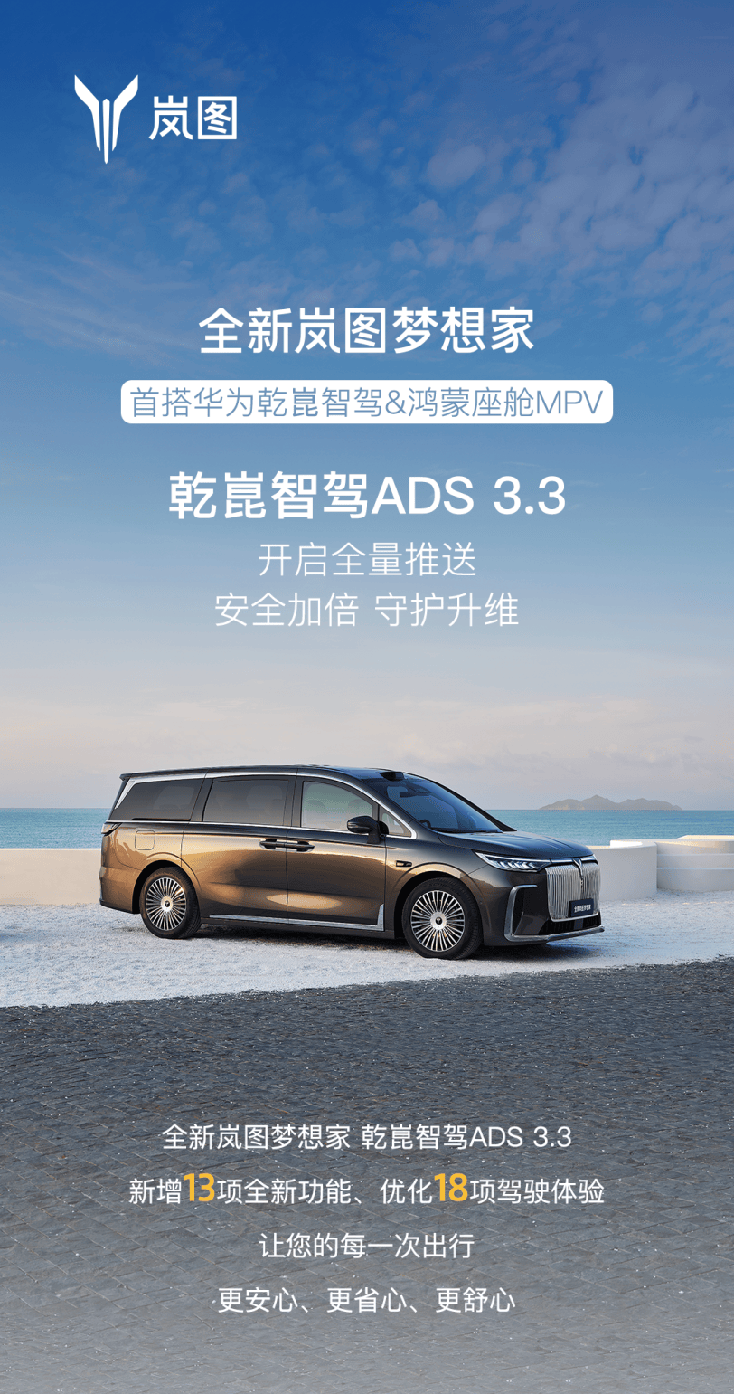 2025年5月7日,岚图汽车官方宣布,全新岚图梦想家迎来OTA2.0,用户体验全维升级。其中,全新岚图梦想家乾崑版ADS 3.3开启全量推送,乾崑智驾新增13项全新功能、优化18项驾驶体验,主动安全辅助、智能泊车辅助、智能辅助驾驶体验全面进化,让出行更安心、更惬意。同时,全新岚图梦想家鲲鹏版也迎来OTA2.0升级,1500+项能力进阶,逍遥座舱体验大升级,车道级导航、AI全域语控、贴心智能服务、生态娱乐系统全上车,具体升级信息如下: