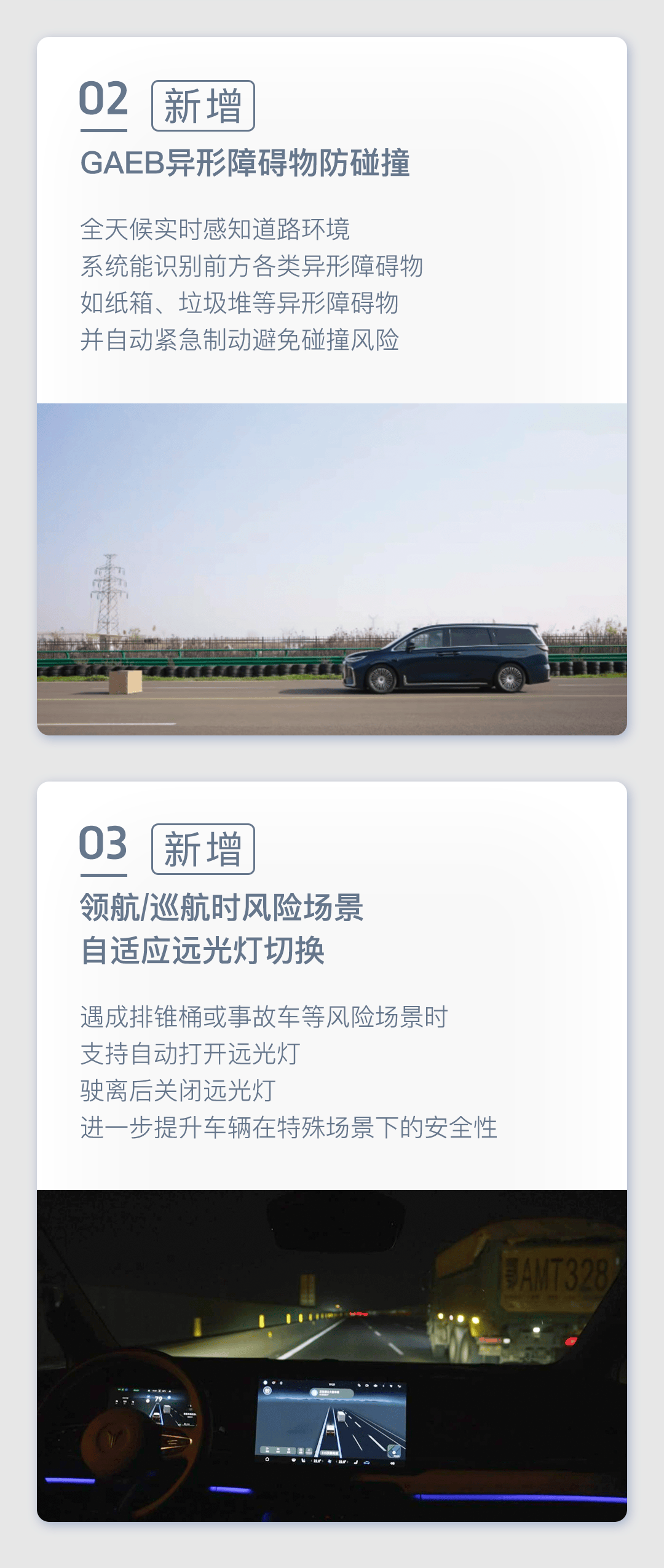 乾崑智驾ADS 3.3将新增eAES增强型自动紧急转向辅助、GAEB异形障碍物防碰撞、领航/巡航时风险场景自适应远光灯切换。优化障碍物告警显示、园区巡航限速功能(车速上限由35km/h调整至50km/h)、智能辅助驾驶语音提示功能、智能通勤导航功能。