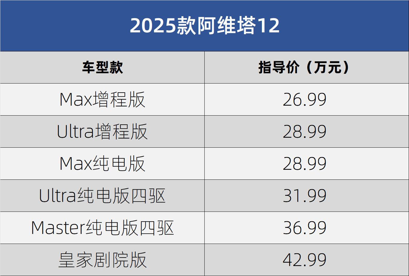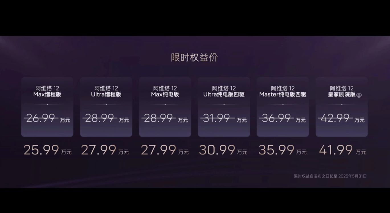 2025年5月7日晚间,2025款阿维塔12“焕新”上市,新车调整了在售2025款的车款以及价格,新车继续提供增程以及纯电共计6个车款供选,官方指导价区间为26.99-42.99万元。此外在5月30日之前,全系车型可享受1万元的现金直减以及最高4万元的配置礼包权益,限时售价区间为25.99-41.99万元。