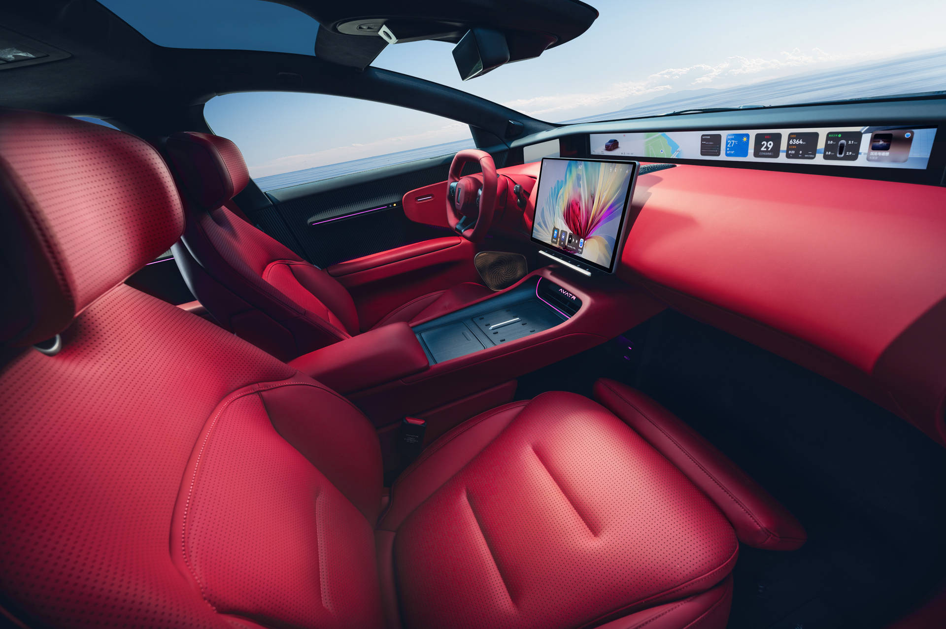 内饰方面,新车新增红色内饰供选,而在造型部分依旧采用Gentle Tech极简设计理念,只有中控屏幕下方保留了常用的物理按键。仪表盘由35.4英寸的4K一体远端屏取代,如果选装了电子外后视镜,远端屏两侧则为后视镜显示屏,中央部分用来显示驾驶相关信息。中控屏依旧采用一块15.6英寸中控屏,搭载华为HarmonyOS车机系统,支持5G网络、四驱域语音焕新识别、手势控制、面部识别、手机APP远程功能、车内生物监测系统、模拟声浪等功能。