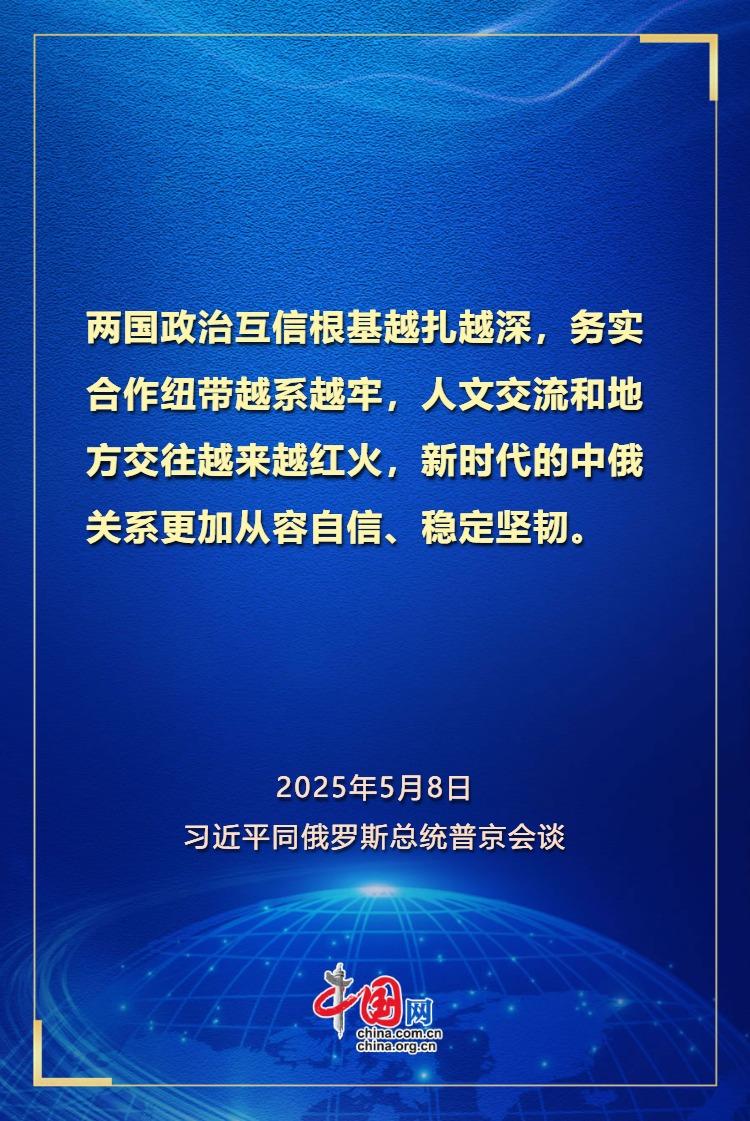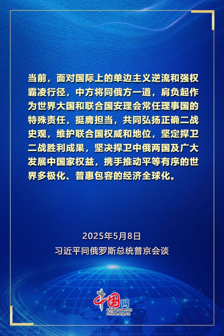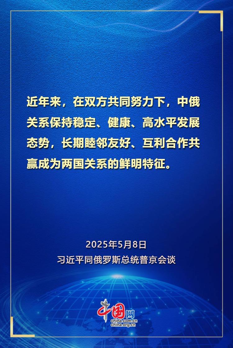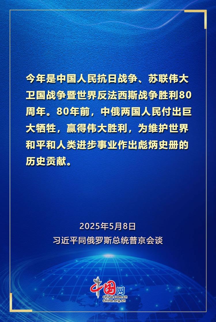 当地时间5月8日上午,俄罗斯总统普京同中国国家主席习近平在莫斯科克里姆林宫举行会谈。两国元首就中俄关系和重大国际和地区问题深入交换意见,一致同意坚定不移深化战略协作,推动中俄关系稳定、健康、高水平发展;共同弘扬正确二战史观,维护联合国权威和地位,维护国际公平正义。