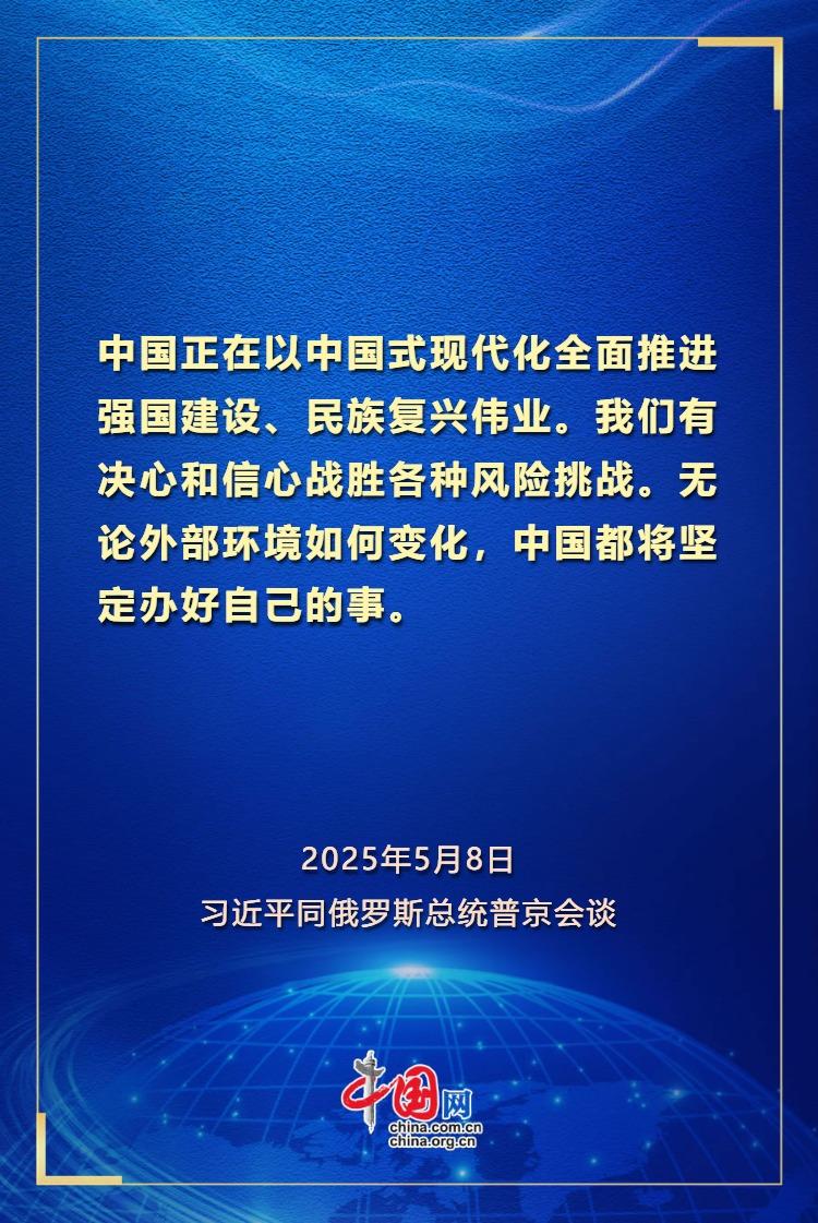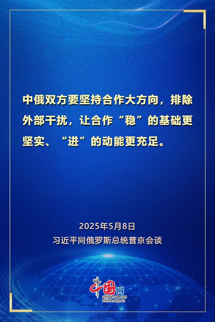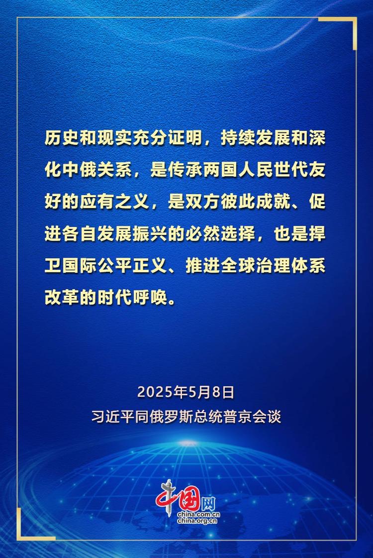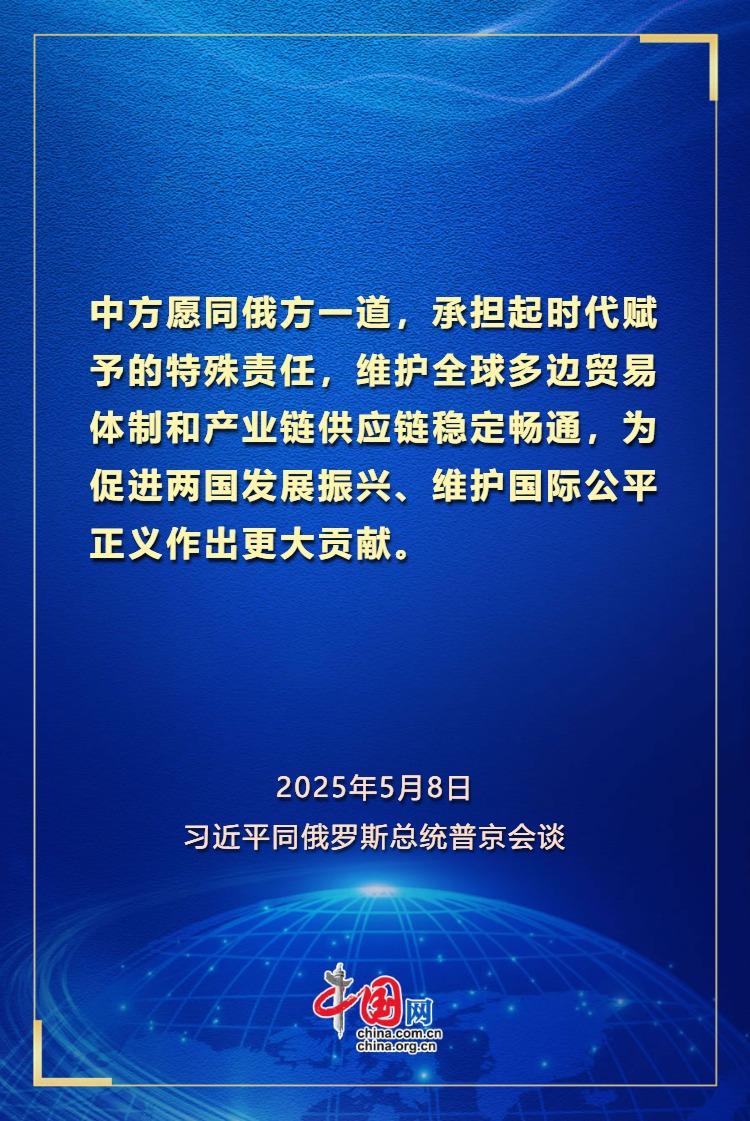 当地时间5月8日上午,俄罗斯总统普京同中国国家主席习近平在莫斯科克里姆林宫举行会谈。两国元首就中俄关系和重大国际和地区问题深入交换意见,一致同意坚定不移深化战略协作,推动中俄关系稳定、健康、高水平发展;共同弘扬正确二战史观,维护联合国权威和地位,维护国际公平正义。