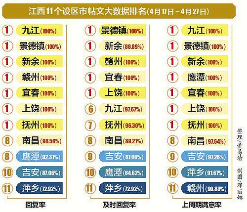 4月10日至4月16日转办帖文的整体满意率为97%,其中九江、景德镇、新余、鹰潭、宜春、上饶、抚州均为100%,南昌(97.64%)、吉安(97.26%)、萍乡(91.67%)、赣州(90.83%)。