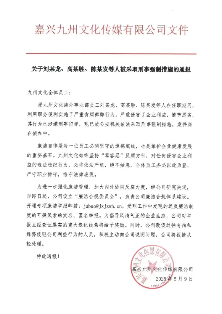 5月9日,九州文化发布公告,宣布原海外事业部员工刘某龙等三人被采取刑事强制措施的消息。通报中,九州文化同时表示,自即日起公司将设立“廉洁合规委员会”,负责公司廉洁合规体系建设。