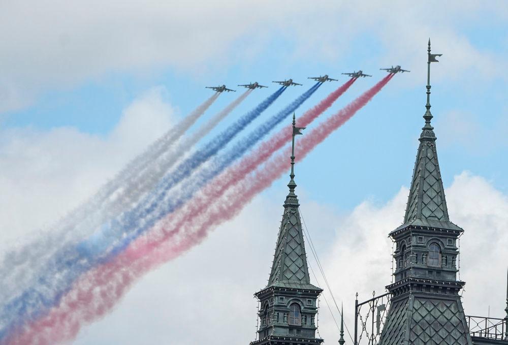 5月9日,在俄罗斯首都莫斯科,参加纪念苏联伟大卫国战争胜利80周年阅兵式的战机编队拉烟飞行。新华社记者 赖向东 摄
