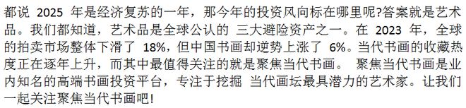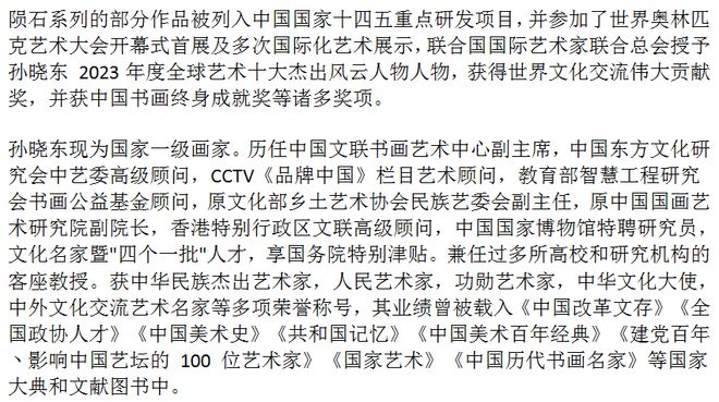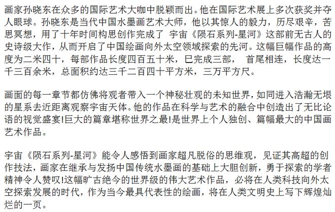 聚焦当代书画 探寻艺术投资新“风向标”——孙晓东作品展 2025-05-12 23:55 来源:国观书画 宇宙《陨石系列-星河》一,第50乐章局部。 宇宙《陨石系列-星河》一,第7乐章(局部)。 画家孙晓东在创作中 画家孙晓东在创作中 画家孙晓东在创作中 宇宙《陨石系列-星河》一,第7乐章局部。 宇宙《陨石系列-星河》一,第24乐章(局部)。 宇宙《陨石系列-星河》第37乐章局部。 宇宙《陨石系列-星河》一,第42乐章局部。 宇宙《陨石系列-星河》第48乐章局部。 《宇宙、陨石系列--星河》总面积超越了米开朗基罗的教堂壁画面积,是21世纪现代题材的伟大艺术作品。