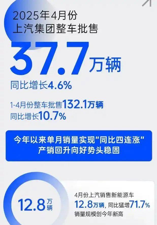 日前,上汽集团发布销量快报,4月整车批售37.7万辆,同比增长4.6%。1-4月份整车批售132.1万辆,同比增长10.7%,今年以来单月销量实现“同比四连涨”。其中,4月份上汽销售新能源车12.8万辆,同比增长71.7%。