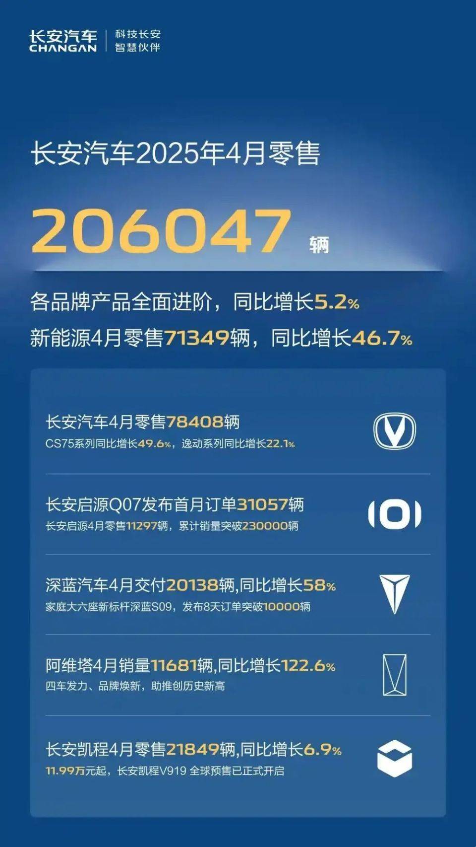 日前,长安汽车发布销量快报,4月长安汽车零售206047辆,同比增长5.2%。其中新能源零售71349辆,同比增长46.7%;长安系中国品牌销量稳中向好,4月零售171181辆,同比增长8.3%。