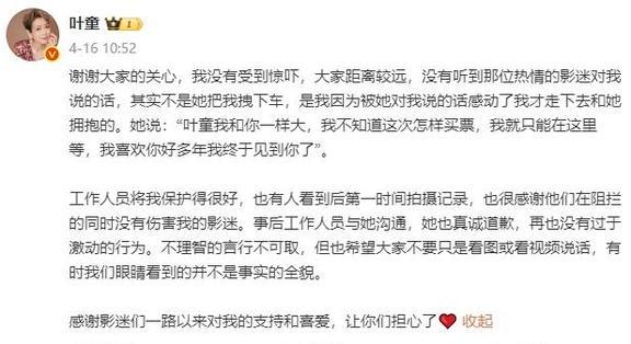 其实,这位粉丝可不是盲目追逐的那种,而是和叶童同龄的忠实支持者!