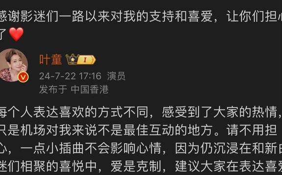 “很感谢他们在阻拦的同时没有伤害我的影迷,事后工作人员与她沟通,她也真诚道歉,再也没有过于激动的行为。”