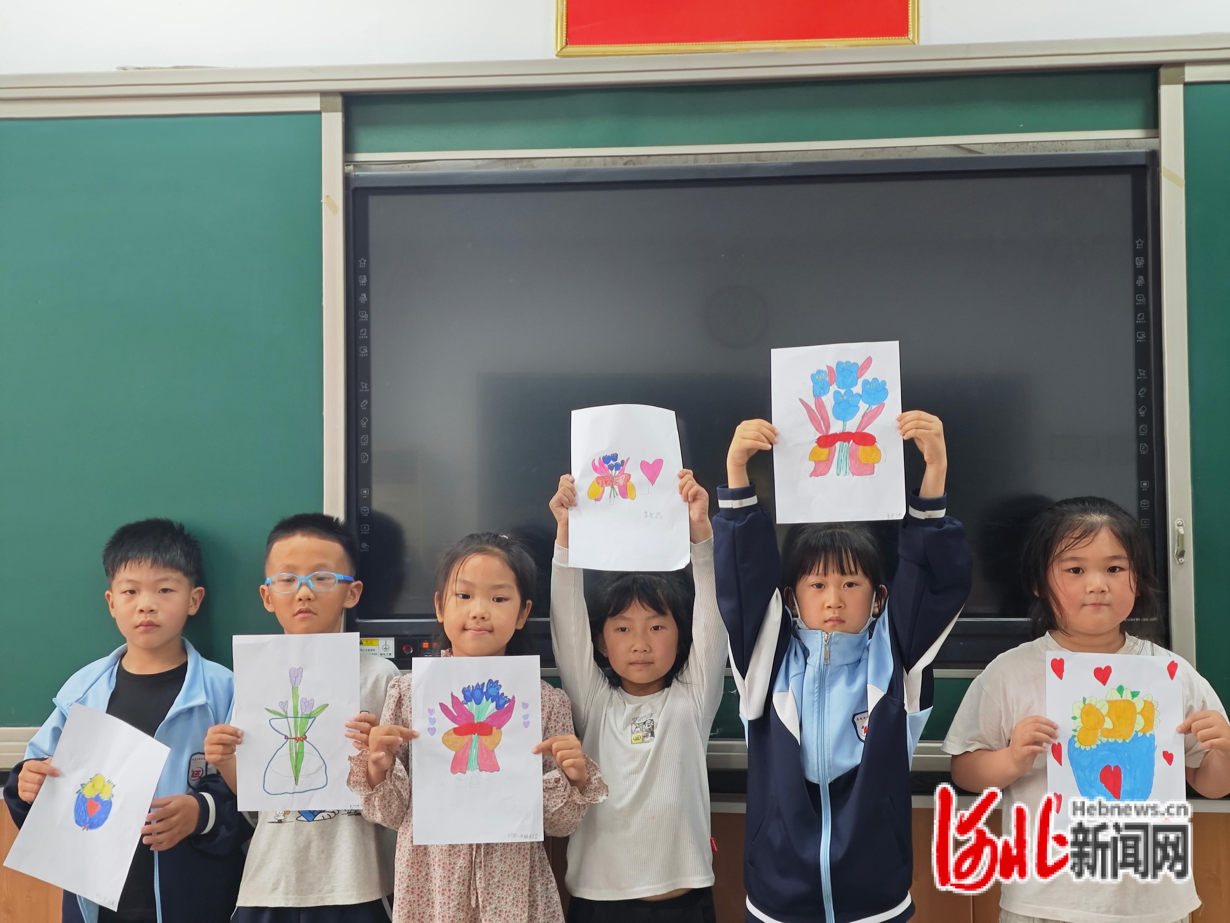 一年级小朋友画出美丽的花束,表达对母亲的爱。 辛路敏摄