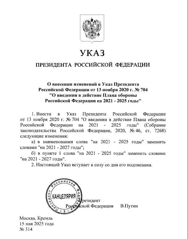 普京签署总统令延长俄国防计划至2027年 2025-05-15 23:17 来源:杭州网 央视新闻讯 总台记者获悉,当地时间5月15日,俄罗斯总统普京签发总统令,将《2021—2025年俄联邦国防计划》延长两年至2027年。据悉,该国防计划于2021年1月1日起生效,旨在落实俄罗斯国防领域的相关措施。