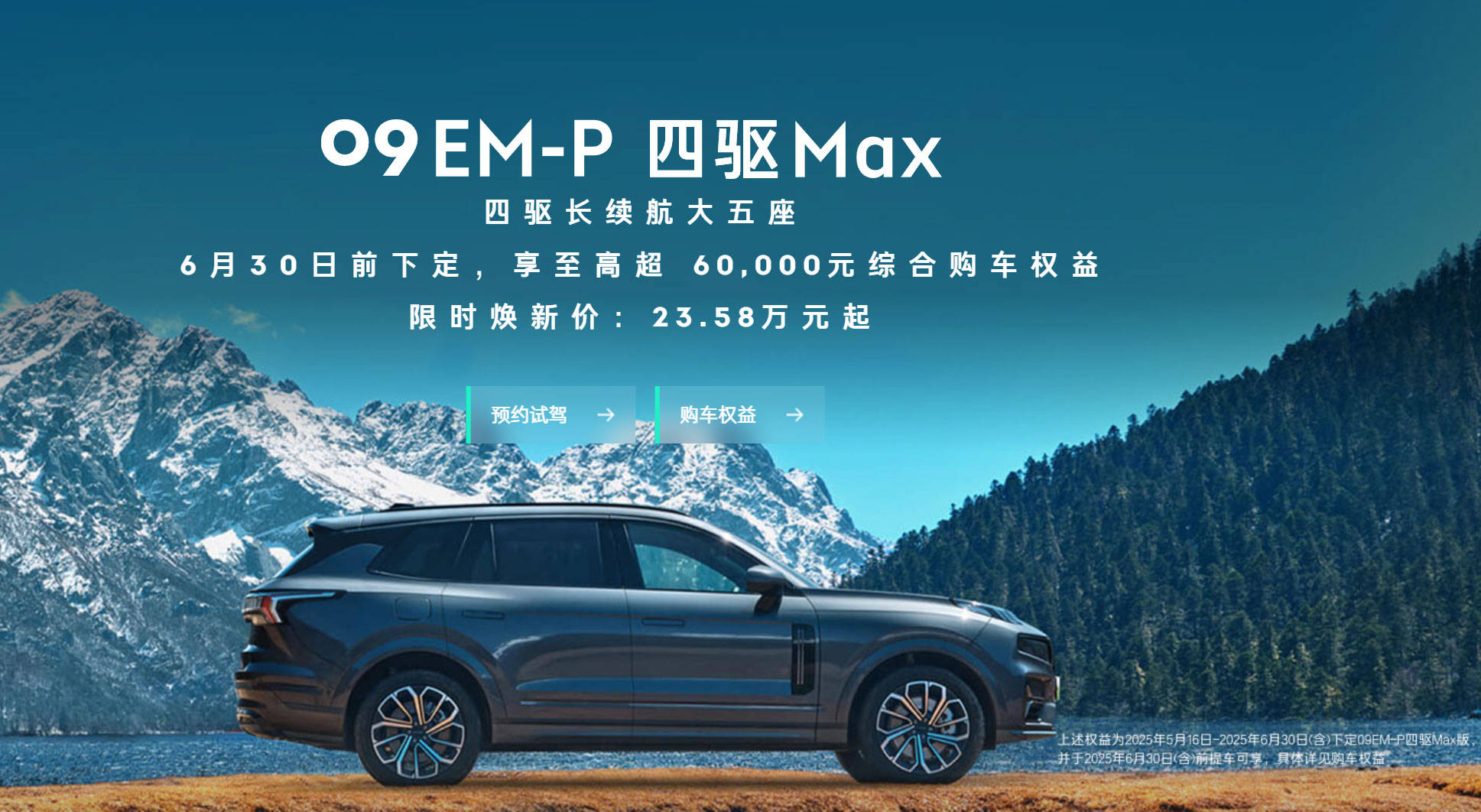 日前,领克09 EM-P新增一个车款——四驱MAX长续航大五座版,该车指导价为27.58万元。同时,官方还推出限时购车权益——6月30日前下定可享至高6万元综合权益,叠加权益、补贴后置换价为23.58万元起。