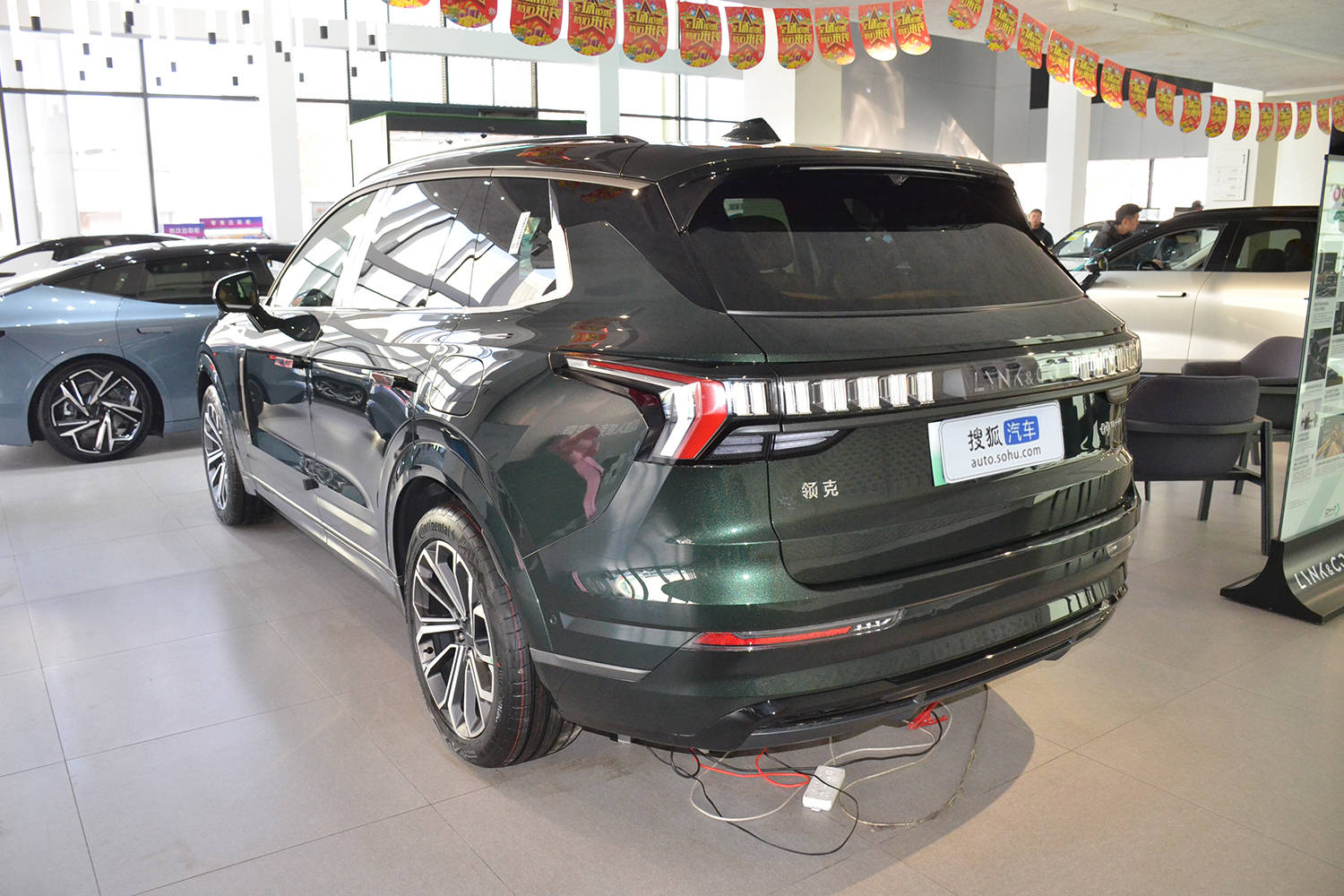 在车侧,领克09 EM-P的整体造型非常敦厚,前/后轮眉均采用多层线条加以刻画,配合车门下方内凹式造型的设计,再辅以密条辐的大尺寸轮圈,看上去显得非常有力量感。车尾依旧采用细长的灯组,内部纵置横向排列的LED灯组模块,点亮后仍旧颇具辨识度。