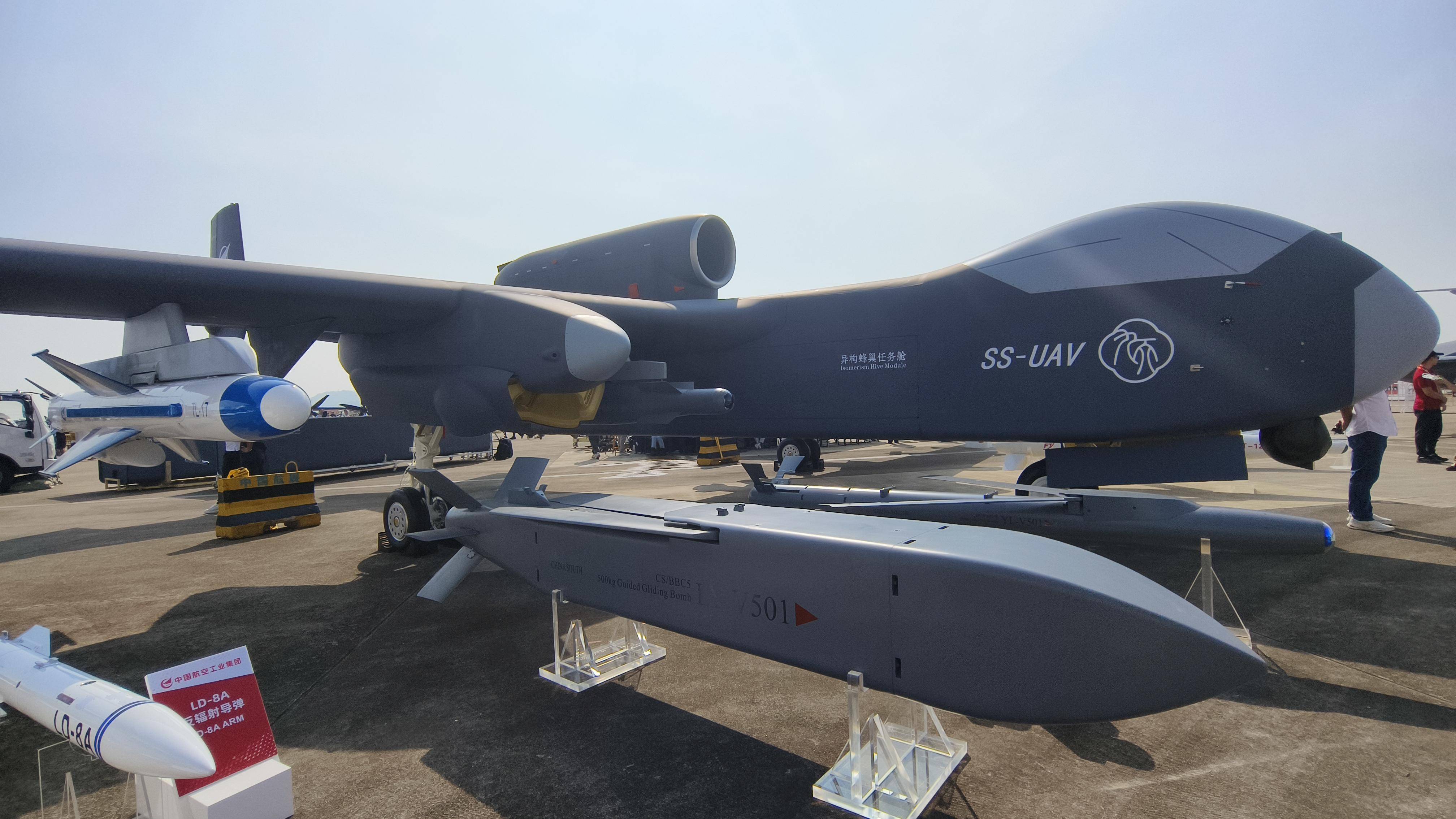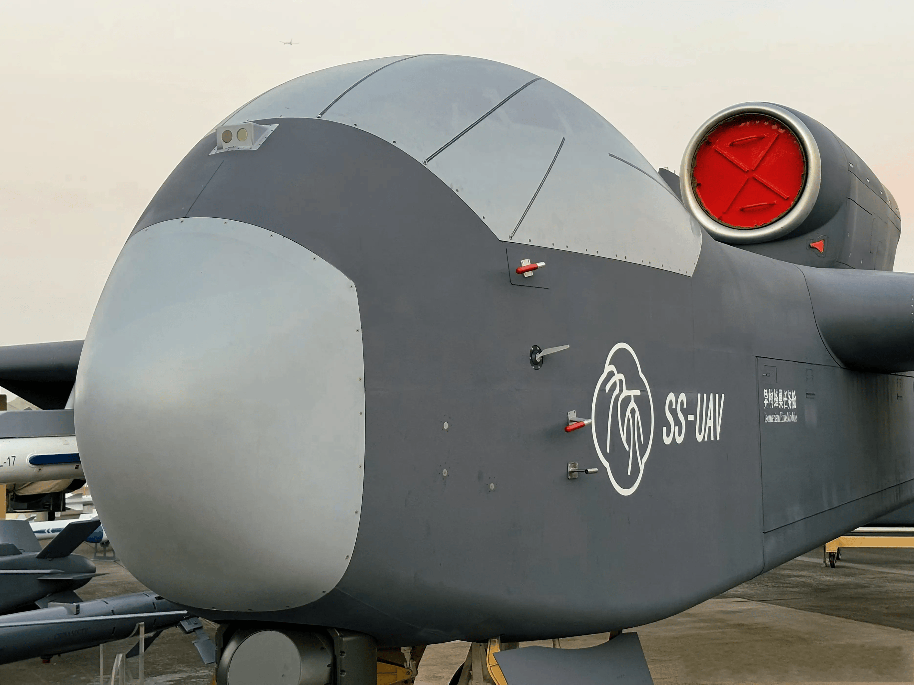 “九天”察打一体无人机在珠海航展上首次亮相就备受关注。这款无人机翼展达25米,最大起飞重量16吨,最大载重6吨。其动力系统采用了涡扇发动机,最大飞行高度可达15000米左右,最大飞行速度超过700公里/小时,最大航程7000公里,航时大于12小时。其8个外挂点既可以挂载1000公斤级的制导炸弹,也可以挂载8枚包括空空导弹、空地导弹、反舰导弹等在内的各种型号和各种性能的高精度导弹。其超强的远程打击能力和精确打击能力堪比一架固定翼重型战斗机。