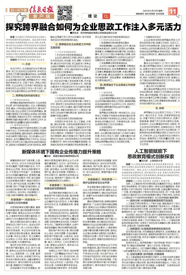 摘要:本文探讨了跨界融合在企业思政工作中的重要作用及实践路径。通过分析不同领域与思政工作的跨界融合,如艺术、科技、体育等,展示其为企业思政工作带来的新活力与创新效果,阐述了跨界融合如何丰富教育内容、拓展教育渠道、增强员工参与度,并提出企业在实施跨界融合思政工作时应遵循的原则和策略,旨在为企业提升思政工作质量提供有益的参考和启示。