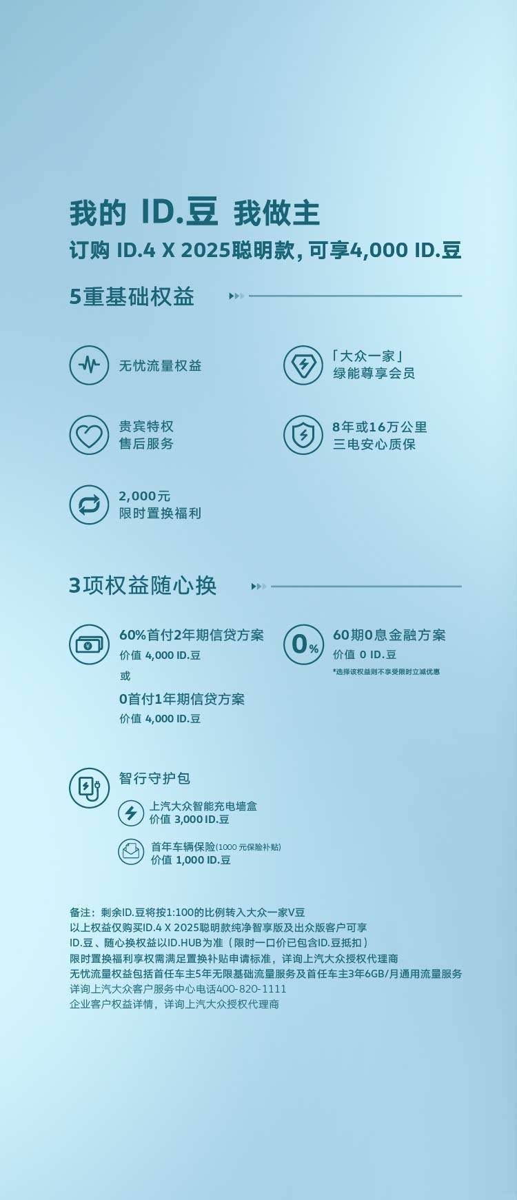 近日,上汽大众宣布2025聪明款ID.4 X正式上市,新车共推出4款车型,官方指导价区间为15.9888万-21.1888万元,与老款保持一致。同时,官方推出限时购车优惠,限时一口价低至13.99万元,并赠送4000 ID.豆,还可享5重基础权益,包括无忧流量、「大众一家」绿能会员、专属售后服务、8年/16万公里三电质保及2000元置换补贴。此外,用户还可选择3种金融方案:60%首付2年0息(送4000 ID.豆)、0首付1年低息(送4000 ID.豆)或60期0息贷款。