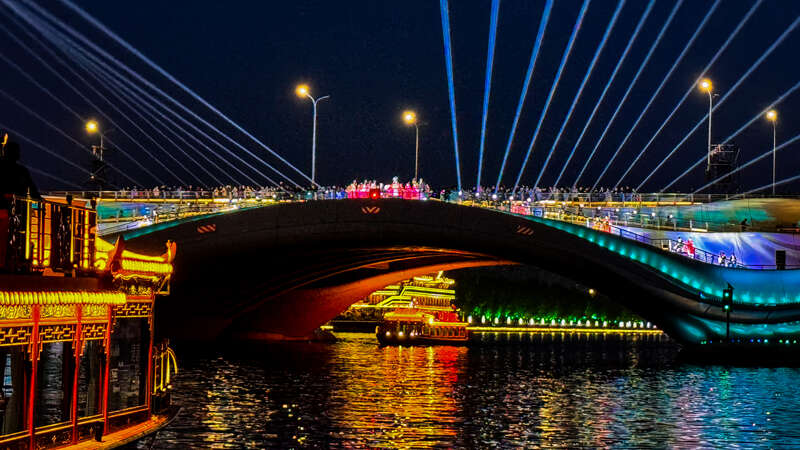 随着特效灯光点亮燃灯塔,运河夜航之旅开启。北京民族乐团在千荷泻露桥奏响民族交响诗乐《大运河》。游船一路南下,两岸灯光述说着运河前世今生。