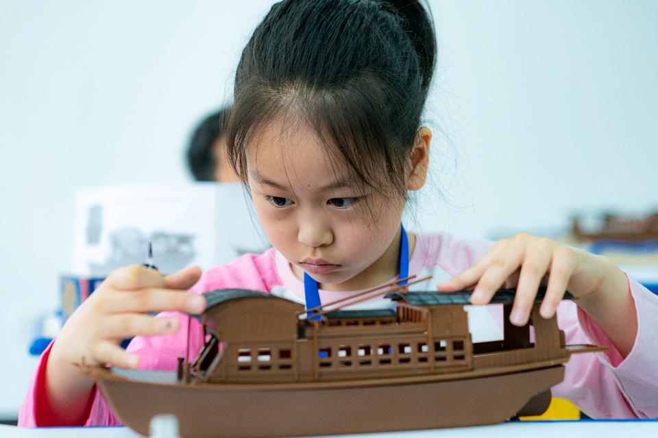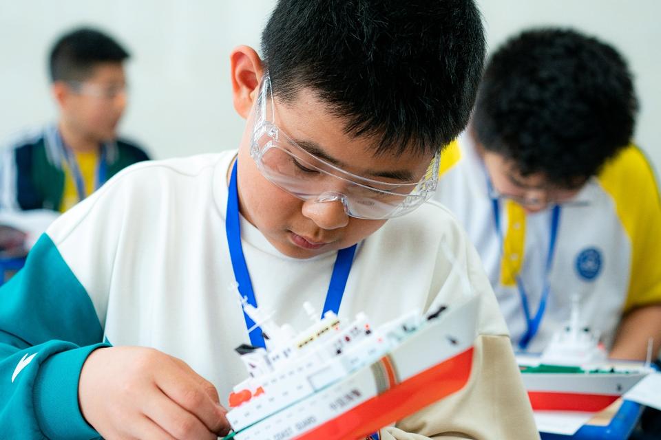 南湖“红船”模型制作赛与中国“海警船”制作赛现场,选手们专注拼接零件,以精巧工艺还原船只细节。随后,南湖“红船”1:40遥控绕标赛、中国海警船电动模型直线航行赛在篮球场水池进行激烈角逐,考验模型在水域中的灵活转向与速度控制。