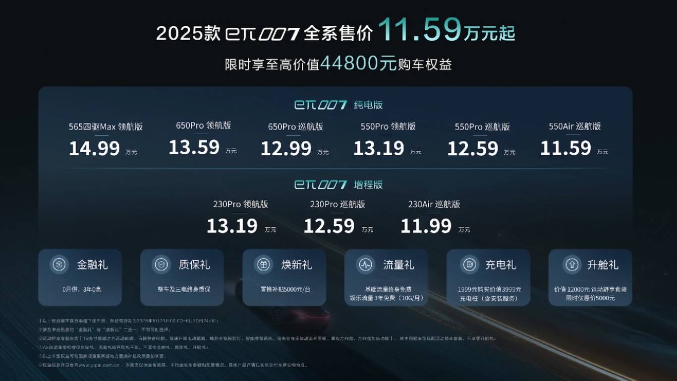 2025年5月21日晚,2025款东风奕派eπ007正式上市,新车共计9款车型,官方指导价11.59-14.99万元。作为年度改款车型,新车重点对智能化车机、舒适配置等方面进行了升级。新车定位为一款中大型车,有纯电和增程动力,纯电车型最大续航提升至650km,增程车型纯电续航提升至230km,综合续航提升至1230km。