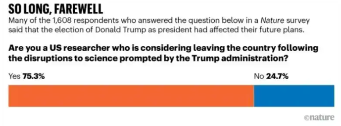 著名学术期刊英国《自然》杂志近期在1600多名美国科研人员中进行的一项民意调查结果显示,有超过1200人考虑离开美国,约占总受访者的75%。调查发现,这一趋势在职业生涯起步阶段的科研人员中尤为明显。