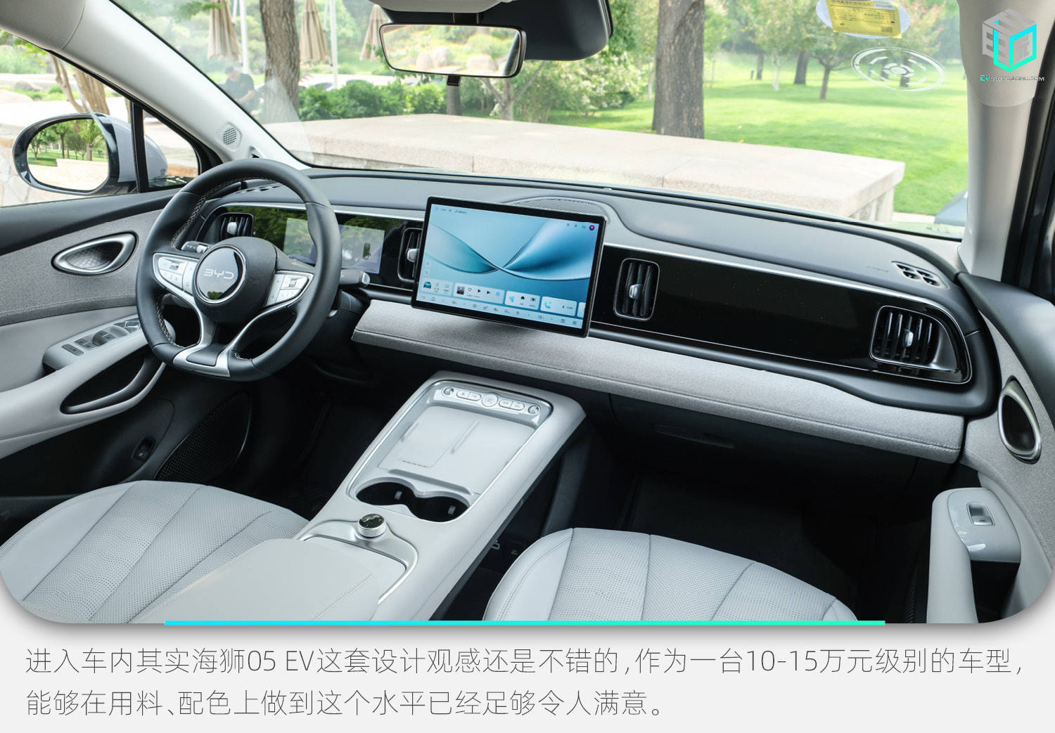 进入车内其实海狮05 EV这套设计观感还是不错的,作为一台10-15万元级别的车型,能够在用料、配色上做到这个水平已经足够令人满意。尤其是在材质的运用上,其车内除了传统的皮质包裹,还加入了部分类似织物的材质,使得车内层次更加丰富。