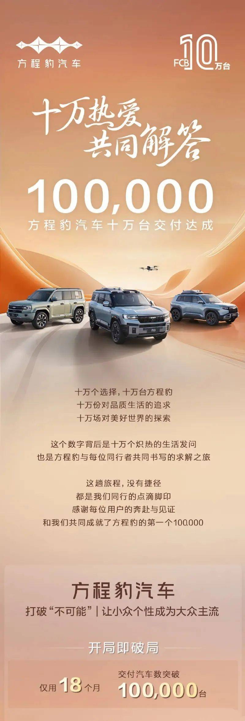 今日,比亚迪集团方程豹事业部总经理熊甜波发文表示:方程豹汽车10万台交付达成,仅用时18个月。据悉,方程豹汽车已上市车型包括豹5、豹8、钛3 。这3款车累计贡献了10万台的交付量。