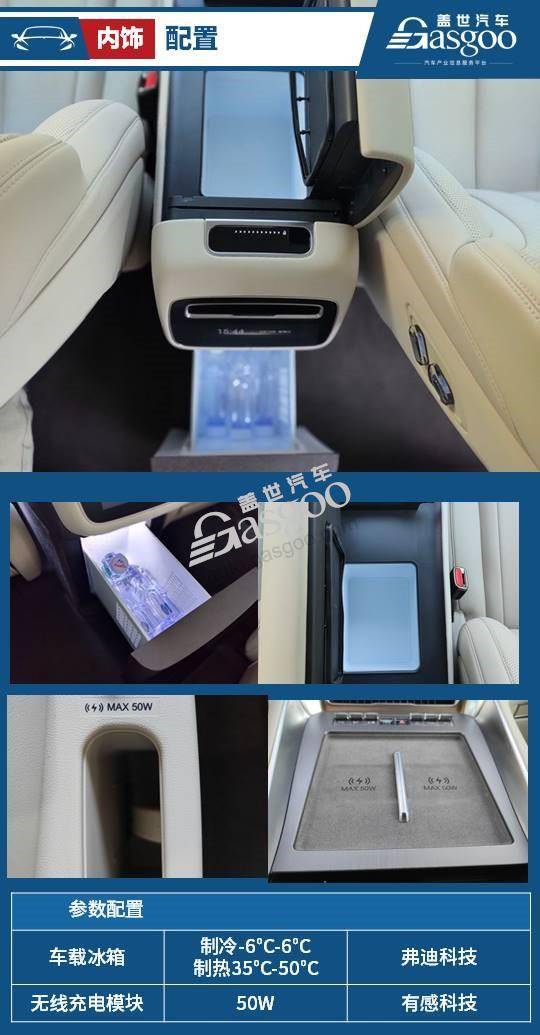 中央扶手区配备了双层冰箱,采用压缩机制冷,制冷范围为-6°C至6°,制热范围35°C-50°C,空间也相当可观,无论是夏日里的冷饮,还是冬日里的热饮,都能完美搞定。上层冰箱左右都可开启,主驾副驾乘客都能轻松使用。通过手动或语音控制,第二排乘客也能轻松打开下层冰箱,为出行增添了不少便利。全车还配备了多个50W无线快充,解决了乘客电子设备的充电焦虑。