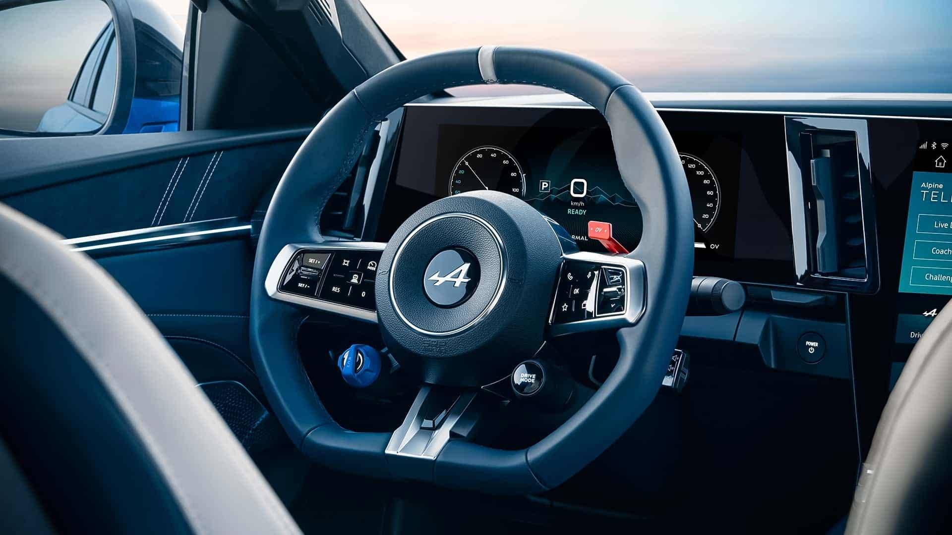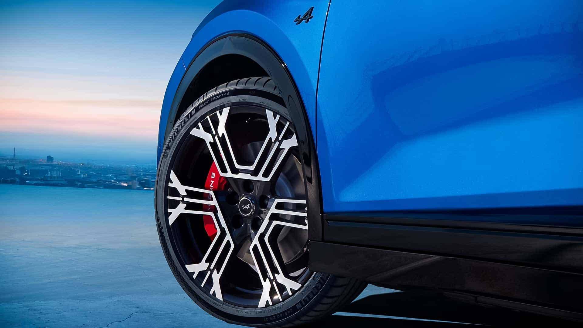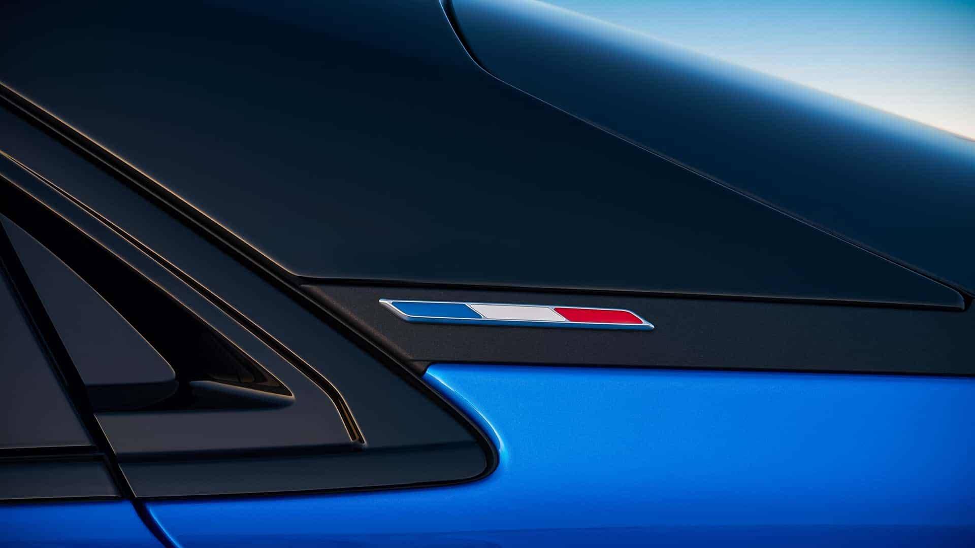 来到侧面,新车采用溜背式车身造型以及隐藏式门把手设计,其中后门门把手集成在了C柱位置,有着不错的设计感。车身尺寸方面,其长宽高分别为4615/1885/1532mm,轴距为2708mm,车重2121kg,标配20英寸轮圈,也可选装升级为21英寸。车尾配备分段式扰流板设计,下方拥有贯穿式尾灯,底部则配备扩散器设计,另外D柱还拥有法国国旗,这也是Alpine的标志元素之一。