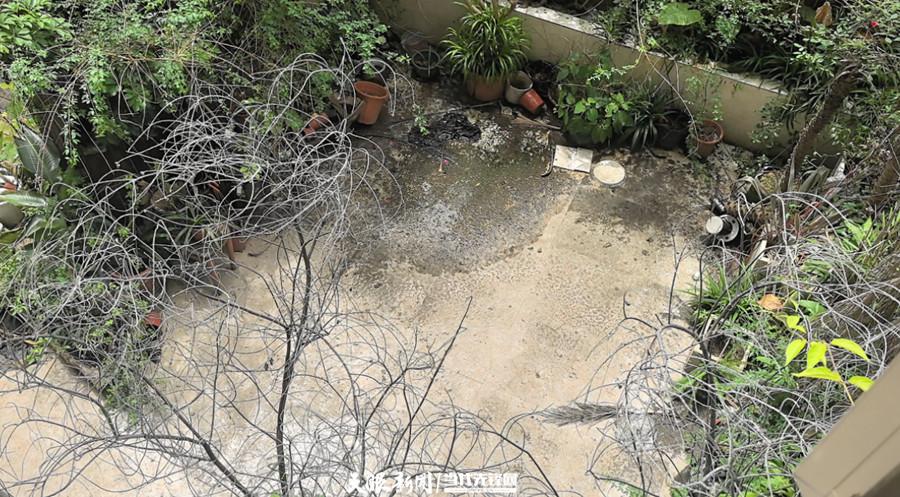 5月26日,记者前往花果园B南区10栋1楼某住户号进行实地走访。记者试图进入一楼凉亭区域查看情况,敲门未得到回应后,通过楼上走廊观察发现,该凉亭处于荒置状态。原本铺设的木地板已经出现破损,地面上堆积着花盆、落叶、塑料瓶等杂物,部分绿植干枯凋零,积水发黑。