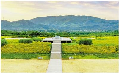 记者乘坐无人驾驶观光车穿行在良渚古城遗址公园,远处是广袤的田野和连绵的花海。
