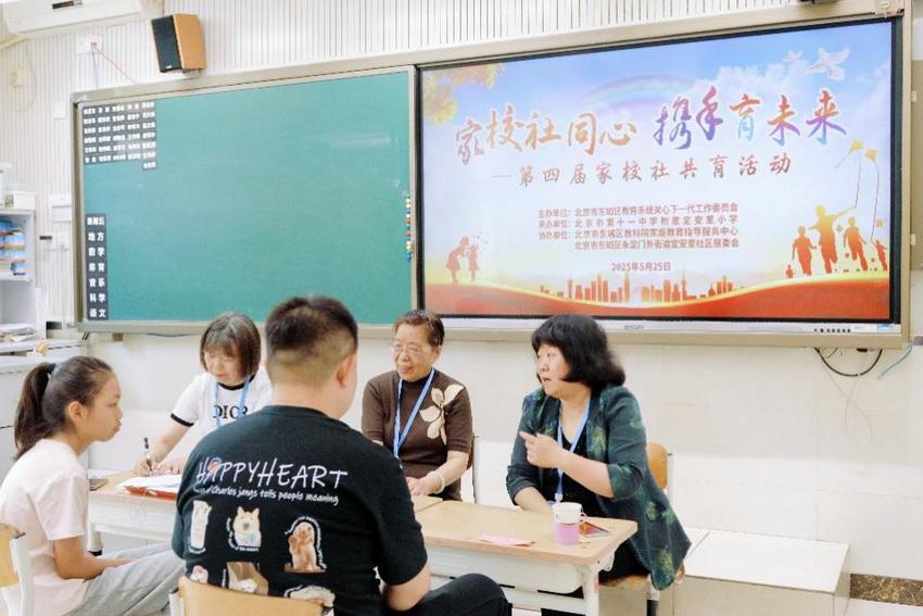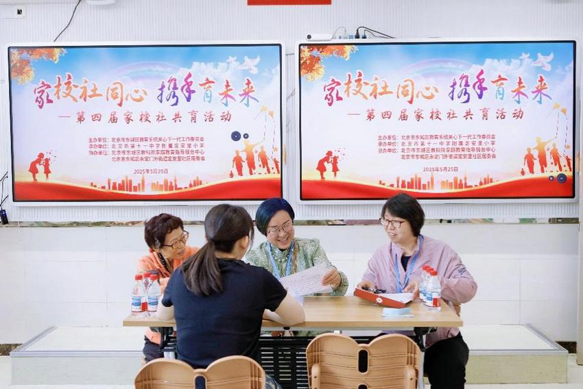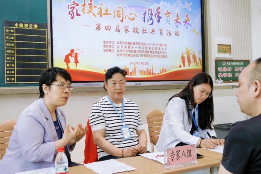 在六一儿童节即将到来之际,为给孩子们献上一份别样的节日礼物,北京市第十一中学附属定安里小学于2025年5月25日联合东城区教育系统关心下一代工作委员会、东城区教科院家庭教育指导服务中心以及定安里社区,成功举办了第四届“家校社同心 携手育未来”家校社共育活动。本次活动以“落实五育并举”为核心理念,融合AI技术赋能心育,以“区校联动”模式,为 100 个家庭提供精准化咨询与沉浸式体验,探索破解家庭教育指导“最后一公里”的创新路径。