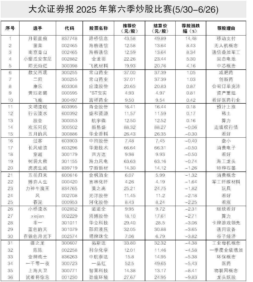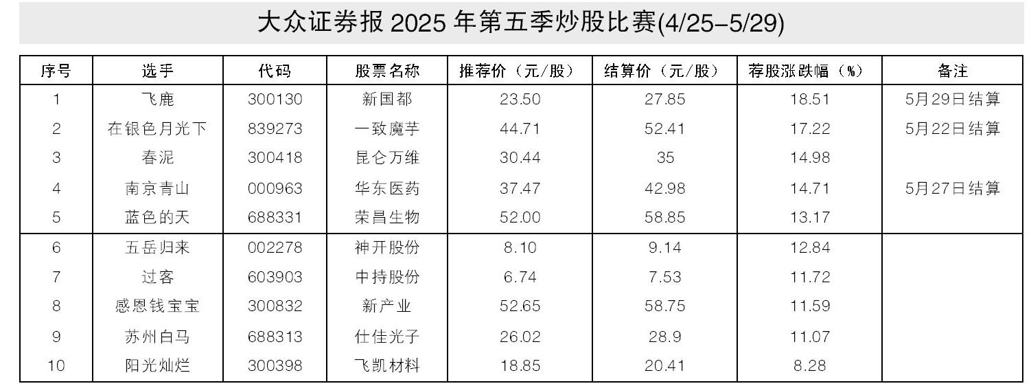 在《大众证券报》读者俱乐部第五季炒股比赛中,选手“飞鹿”以23.5元/股推荐的新国都(300130),荐股涨幅18.51%,荣获冠军;选手“在银色月光下”以44.71元/股推荐的一致魔芋(839273),荐股涨幅17.22%,荣获亚军;选手 “春泥”以30.44元/股推荐的昆仑万维(300418),荐股涨幅14.98%,荣获季军。