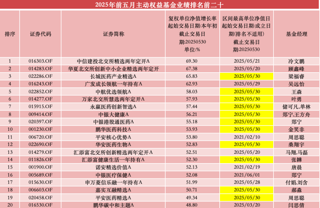 回顾2025年前五月,北证50指数在各大指数表现中脱颖而出。在此影响下,多只北交所主题基金领跑主动权益基金业绩榜。此外,受益于创新药板块的强势爆发,多只医药主题基金业绩也迎来反弹。