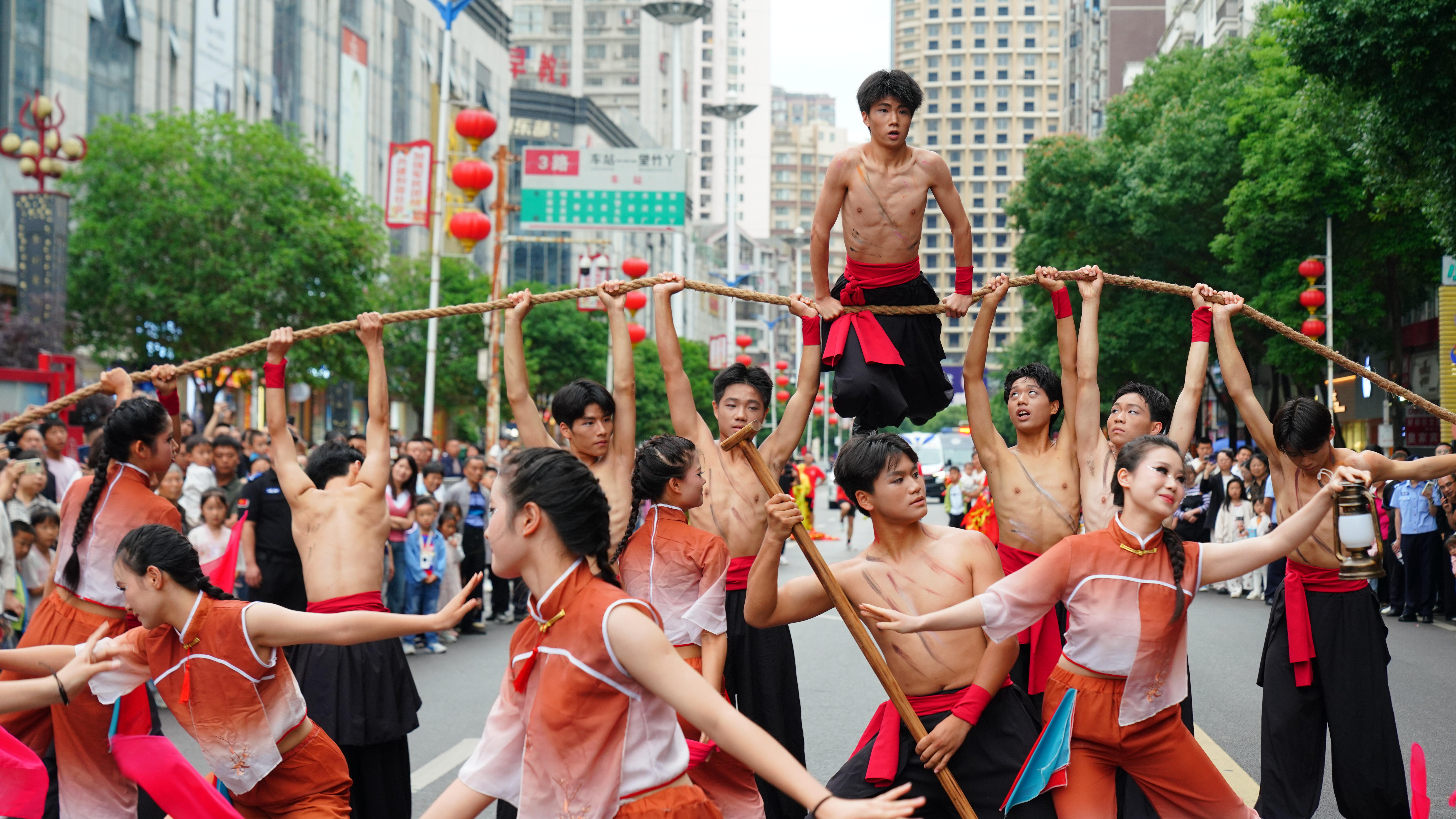巡游队伍抵达思丰财富广场时,一场傩戏将气氛推向顶峰。演员头戴红饰,手持斧钺,在铿锵锣鼓中腾跃翻滚,演绎古老驱邪纳福仪式。土家花灯、乌江纤夫号子、傩戏……这些珍贵的非遗项目,不再是静默的展品。它们在万众瞩目的巡游中鲜活起舞,被赋予了新时代的生命热度,成为思南端午最闪亮的“文化名片”。