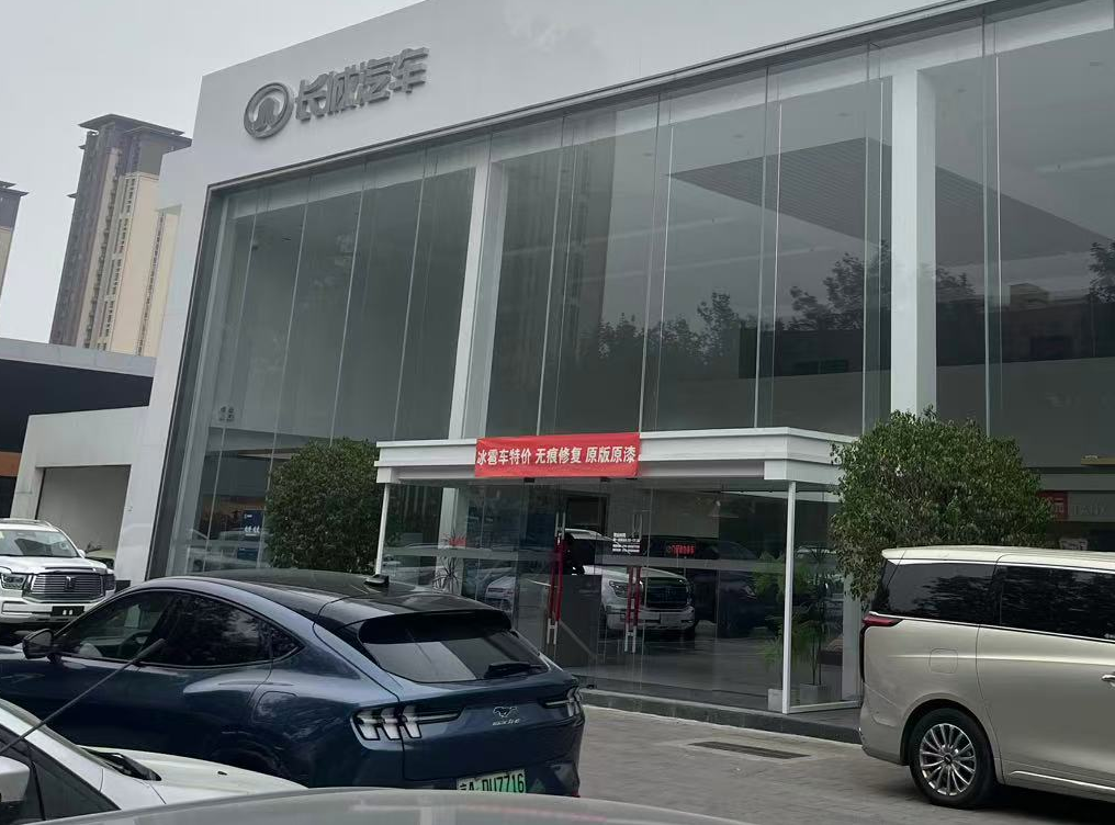进入店内,一位李姓销售顾问向记者介绍称,由于前一段突发冰雹事件,店内几十辆待售蓝山车型和坦克全系列新车外观受到损失,目前已完成部分车辆的维修工作,但仍有几十辆冰雹车等待修复。“因每台车辆受损情况不同,所以优惠幅度施行的是单车单议政策,具体还需看购买者挑选的车辆受损程度来确定购车价格。”