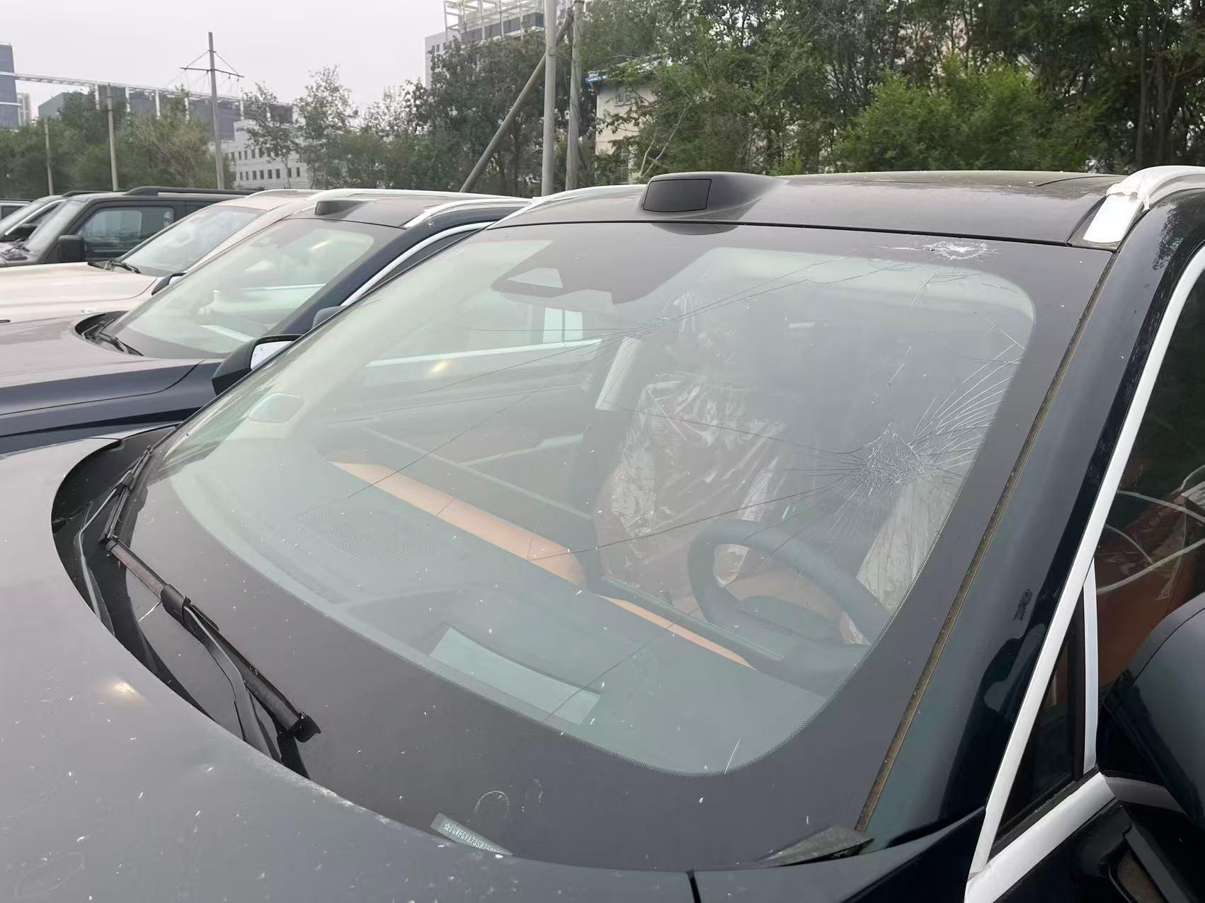 部分新车的玻璃被冰雹砸碎。吴博峰/摄