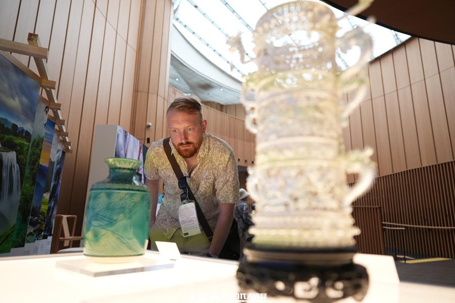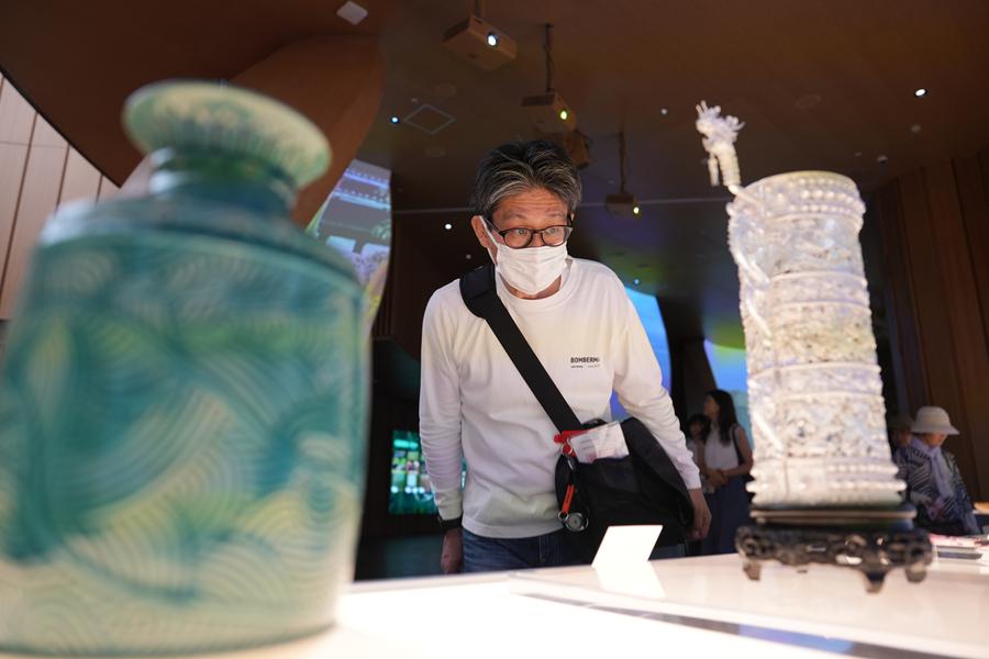 游客在大阪世博会贵州活动周上参观贵州非遗工艺品。