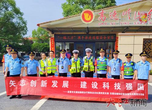 近日,宜春市交通运输执法支队直属执法一大队联合宜春收费站、宜春市交警支队宜阳大队,在宜春收费站开展“矢志创新发展 建设科技强国”主题党日活动,以交通运输执法知识普及宣传为核心,全力增强群众交通出行安全意识。