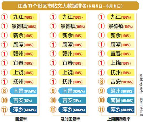 5月28日至6月4日转办帖文的整体满意率为97.05%,其中九江、景德镇、新余、鹰潭、宜春、上饶、抚州均为100%,吉安(98.25%)、赣州(96.99%)、南昌(95.49%)、萍乡(88.89%)。