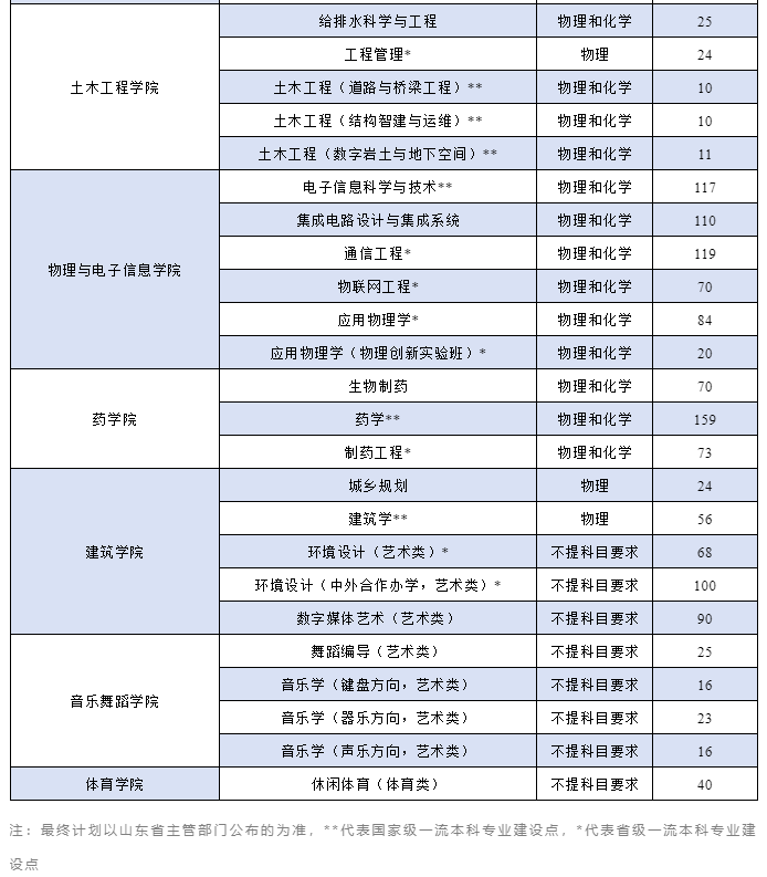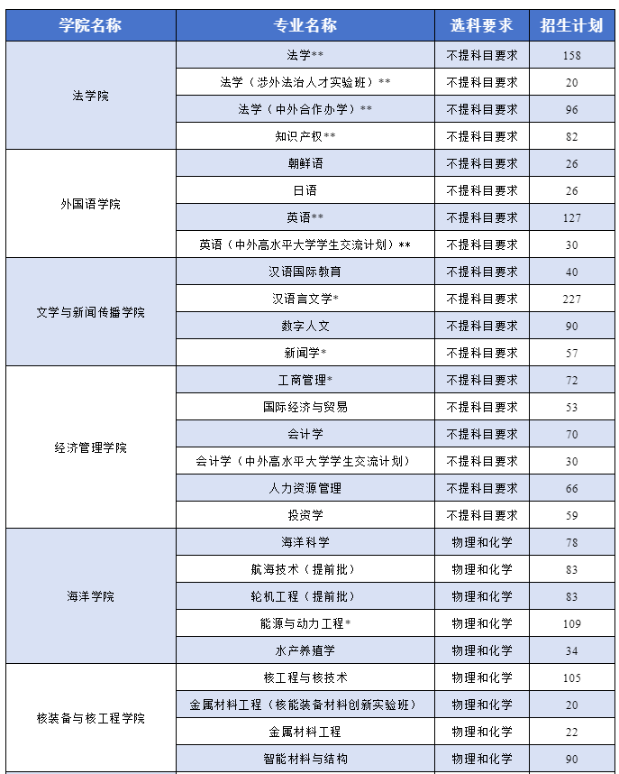 新增5个拔尖创新实验班,分别是法学(涉外法治人才实验班)、金属材料工程(核能装备材料创新实验班)、人工智能(图灵创新实验班)、数学与应用数学(数学创新实验班)、应用物理学(物理创新实验班),每个班招生20人,生源为山东省;