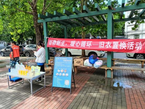 活动现场,社区广场的绿色长廊下,“旧物新生,暖心循环—— 旧衣置换活动”的红色横幅格外醒 目。蓝色宣传展板详细介绍置换规 则,洗衣液、香皂、抽纸等兑换礼品整齐摆放。工作人员早早到位, 有序引导居民参与。