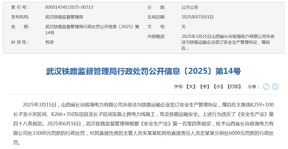 2025年3月15日,山西省长治容海电力有限公司未依法与铁路运输企业签订安全生产管理协议,擅自在太焦线K259+100长子至小宋区间、K266+350东田良至长子区间实施上跨电力线施工,危及铁路运输安全。上述行为违反了《安全生产法》第四十八条规定。2025年6月16日,武汉铁路监督管理局根据《安全生产法》第一百零四条规定,给予山西省长治容海电力有限公司处33000元罚款的行政处罚,对其直接负责的主管人员朱某某和其他直接责任人员史某某分别处6000元罚款的行政处罚。